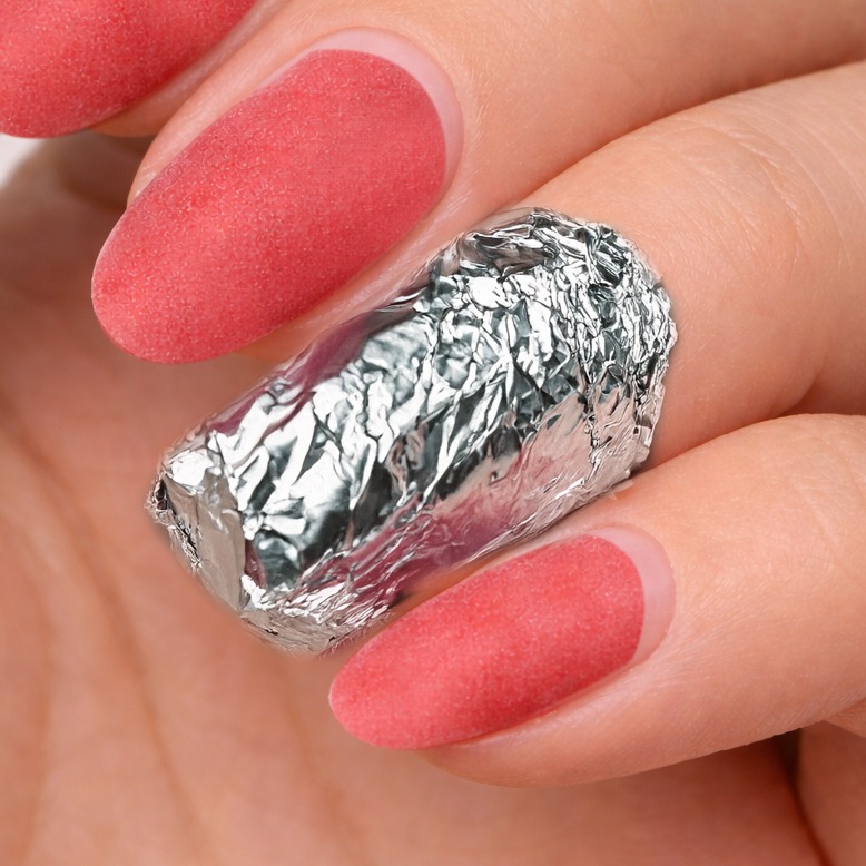 Alufolie abziehen und das gelöste UV-Gel vorsichtig vom Nagel schieben. Kleinere Rückstände können mit der Feile entfernt werden.